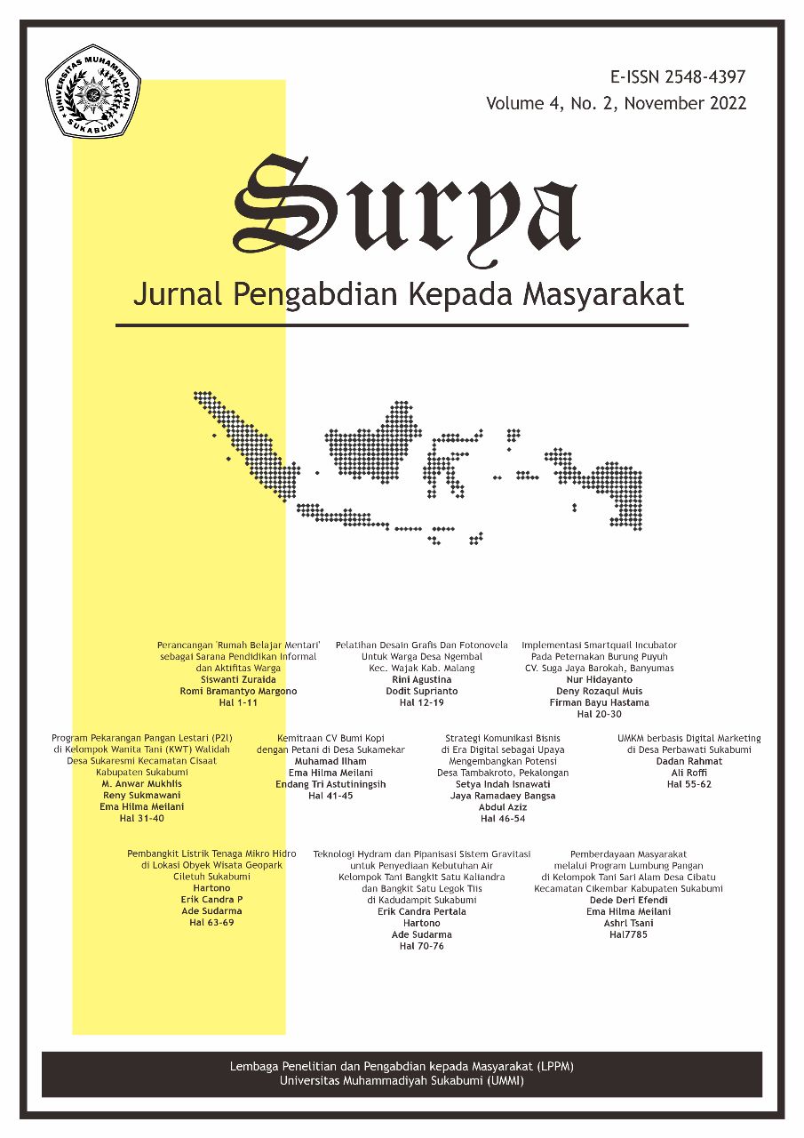 Jurnal Pengabdian Kepada Masyarakat Surya Universitas Muhammadiyah Sukabumi (UMMI) adalah jurnal nasional yang berisi hasil-hasil kegiatan pengabdian dan pemberdayaan masyarakat dari segala rumpun ilmu (Multidisiplin).