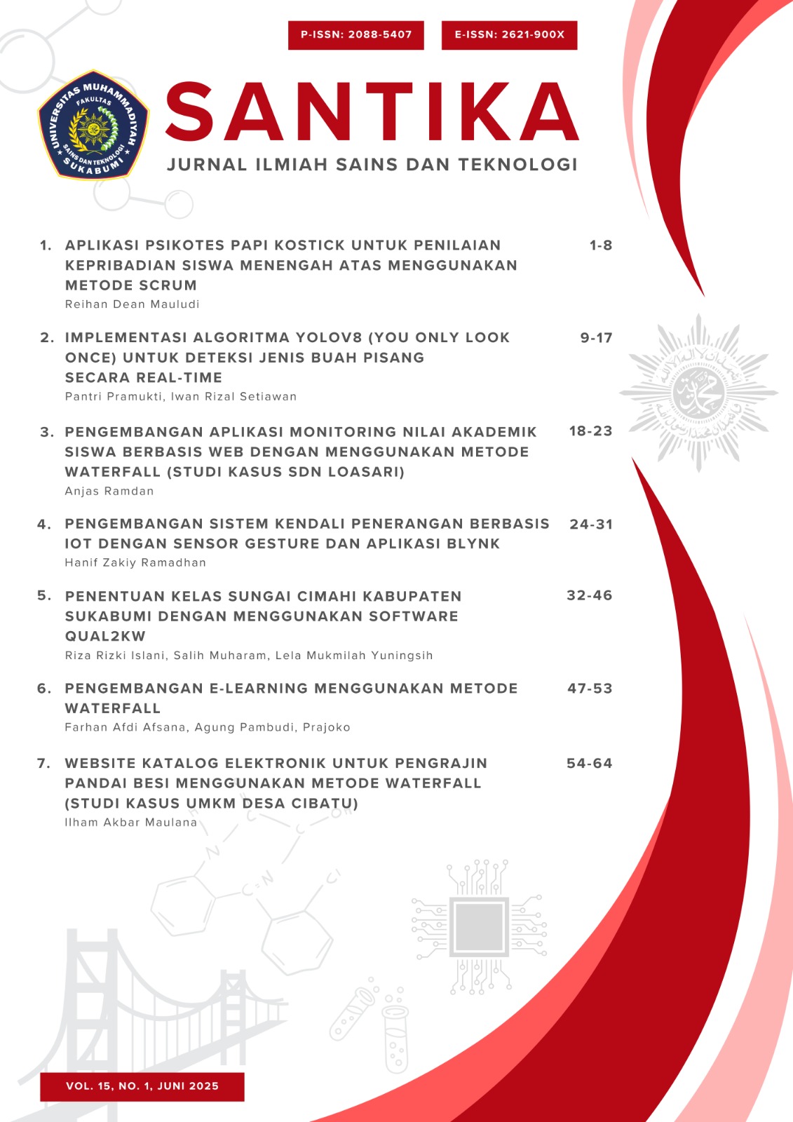 Vol. 15 No. 2 (2025)Santika : Jurnal Ilmiah Sains dan Teknologi (e-ISSN 2621-900X, p-ISSN 2088-5407) is scientific journal published by The Faculty of Science and Technology at Universitas Muhammadiyah Sukabumi (UMMI) and published periodically twice annually on June and December. Santika : Jurnal Ilmiah Sains dan Teknologi firstly published in 2011. It publishes papers in technical paper, conceptual paper and case study reports. This journal provides editorial members, peer reviewers, and authors, both are professional institutions related to Santika aims and scopes. As a national media SANTIKA Journal expected to accommodate the need for a media to disseminate information and latest publication for researchers and practitioners of Science and Technology in Indonesia which focusing in civil engineering, informatics engineering and chemistry and scopes (but not limited) are: